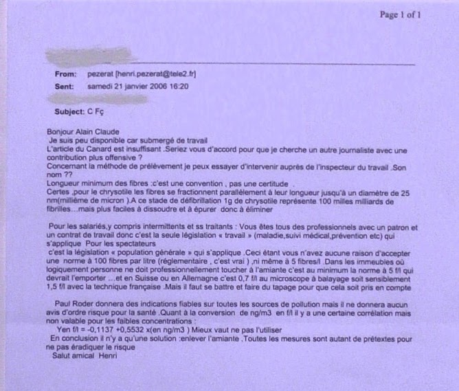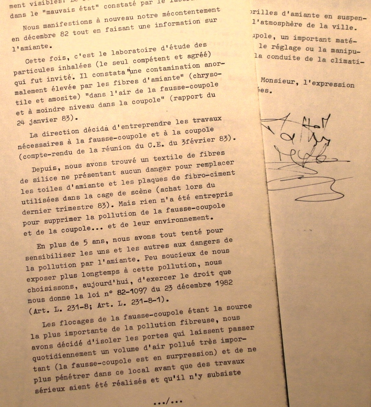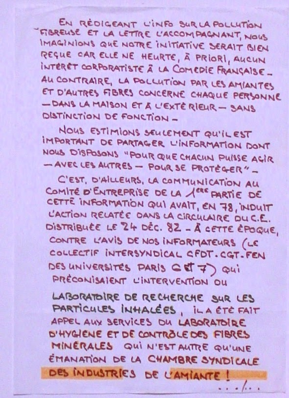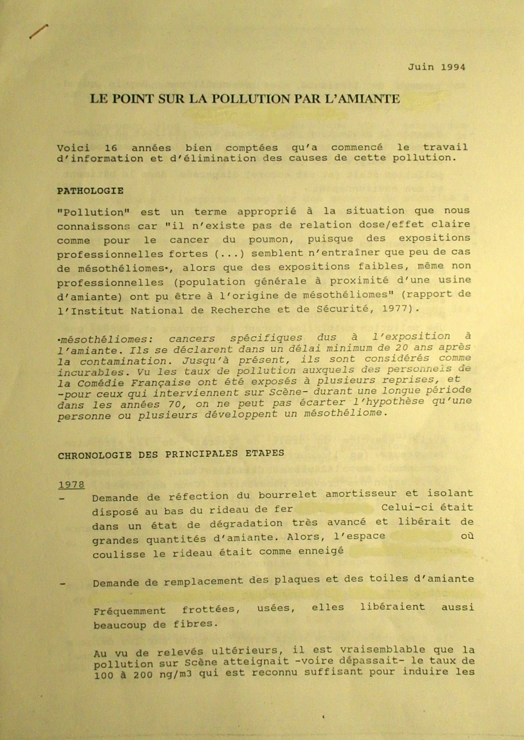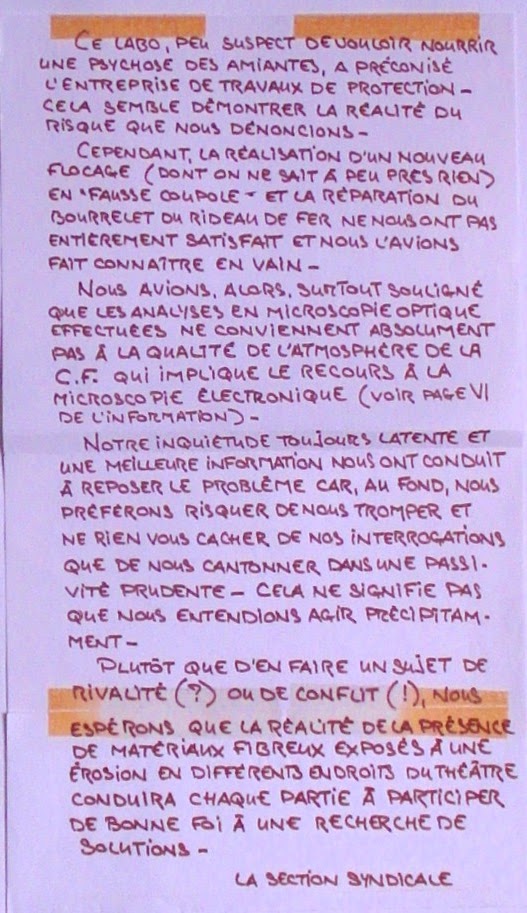 Les résultats d’analyse confirmèrent mes craintes. Je les communiquai à la commission Hygiène et Sécurité du CE en précisant qu’ils pourraient s’adresser au LEPI (Laboratoire des Particules Inhalées de la Mairie de Paris) pour confirmation. Et tout devint très compliqué.