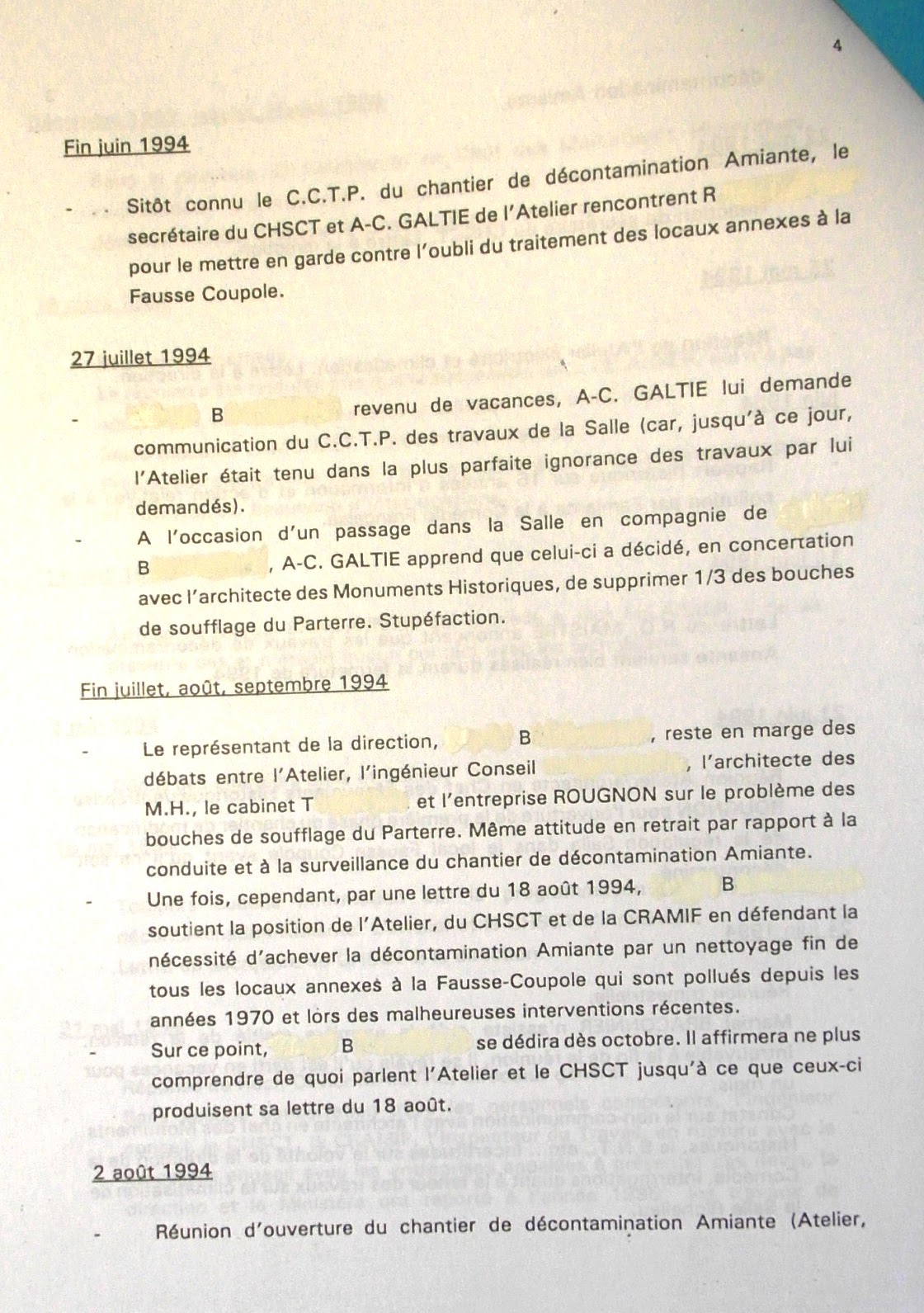 Les résultats d’analyse confirmèrent la présence des amiantes amosite et chrysotile dans les parties techniques. Aussitôt, les élus du CE s’empressèrent de minimiser le risque et d’affirmer : « les autres lieux ne présentent aucun danger…« , bien sûr en taisant l’oubli des plus grands volumes du bâtiment, des lieux spectaculaires où se rencontrent les gens de la maison et les très nombreux visiteurs.