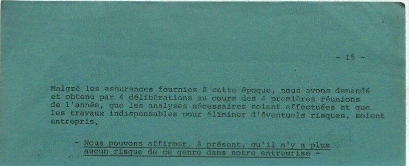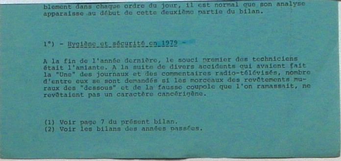 Le secrétaire du Comité d’Entreprise s’attribue le mérite des analyses et des travaux. Il affirme : « il n’y a toujours aucun danger d’aucune sorte dans notre bâtiment relatif aux revêtements d’amiante« .