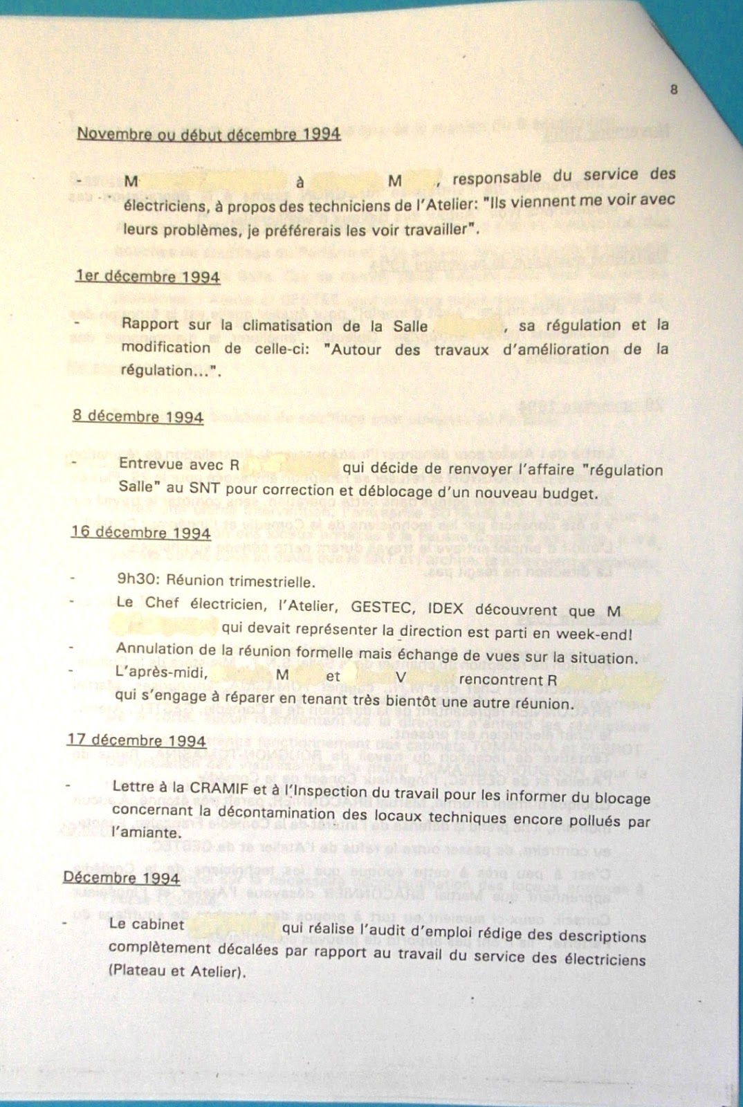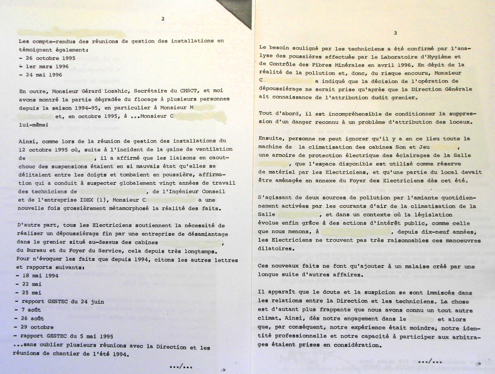 En décembre : alors que je suis délégué du personnel, le chef électricien me confie qu’en effet « l’action contre les pollutions d’amiante est, au moins en partie, à l’origine du blocage de la carrière des techniciens de la Climatisation« . Il tiendra des propos équivalents lors de la réunion de la DRH avec les délégués syndicaux, le 9 juin 1997 : « la sensibilisation au problème de l’amiante, née du travail de l’atelier électrique, a pu jouer en défaveur des salariés de cette équipe« .