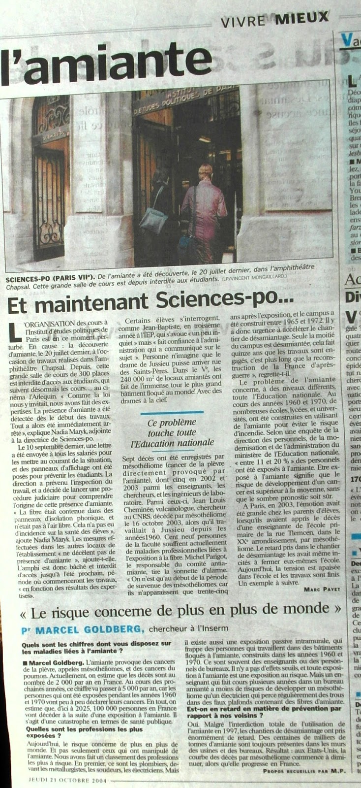 J’avais appris l’amiante en formation professionnelle. C’était un volet de la formation à la sécurité des métiers du froid et du conditionnement d’air car nous rencontrions souvent l’amiante sur nos lieux de travail. Je l’avais rencontré aussi à la Faculté de Jussieu en voulant me préparer au développement de l’énergie solaire à l’époque où celle-ci semblait en plein essor (1). Là, l’alerte avait été lancée en 1973, sinon avant. Entre autres, Henri Pézerat et Jean Grisel avaient fait un énorme travail, et l’information était passée dans les médias, grands et petits (2).