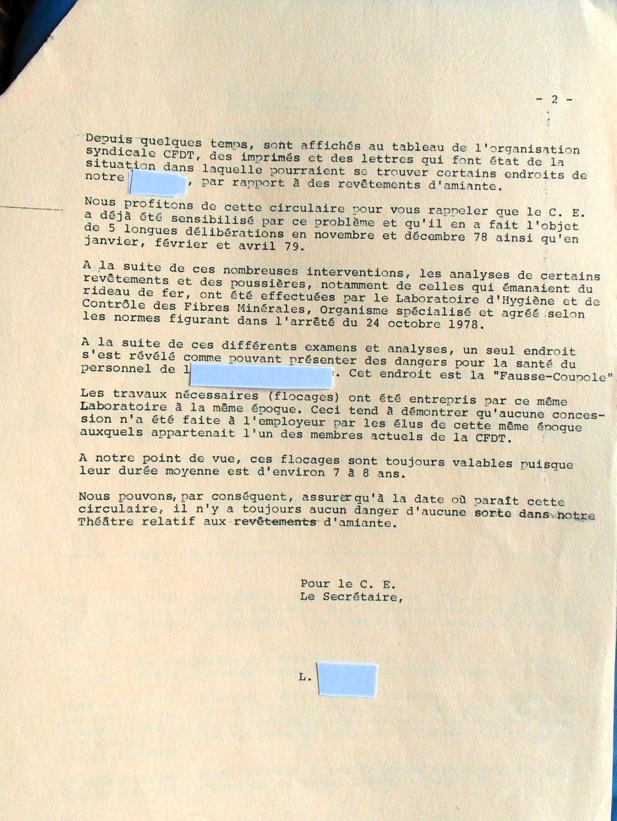 En août, un nouvel inspecteur de la CRAMIF vient à la demande des électriciens du spectacle. Il visite les lieux où subsistent de l’amiante en compagnie de la nouvelle directrice du bâtiment, du délégué du personnel, de mon jeune collègue Fabrice et moi pour le conditionnement d’air. Il constate la dégradation du revêtement de protection et du flocage d’amiante au plafond (fissures du flocage et nombreux flocons grisâtres tombés*. Je rédige le compte-rendu avec le délégué et mon collègue, puis nous le distribuons à la direction et au service médical.
