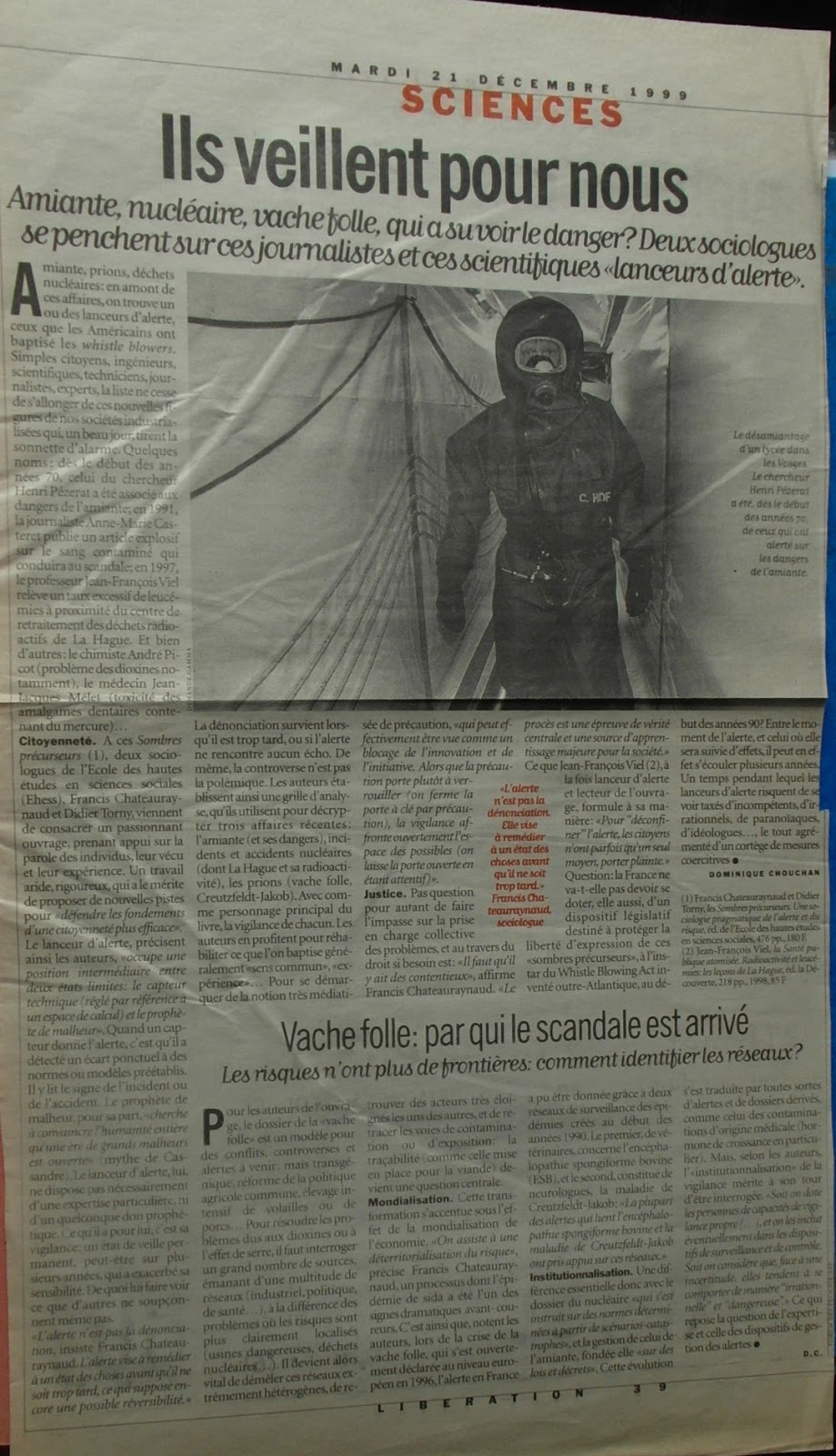 L’article est inspiré par « Les sombres précurseurs. Une sociologie pragmatique de l’alerte et du risque« , un livre de Francis Chateauraynaud et Didier Torny qui vient de sortir. L’article et le livre sont typiques de l’esprit de hiérarchie à la française. Disparus les soutiers de l’alerte, ceux qui en sont souvent à l’origine, qui sur le terrain la maintiennent et prennent tous les risques et les coups. Chateauraynaud et Torny ne prennent en compte que les actions des professionnels déjà insérés et reconnus dans telle ou telle institution, ceux qui ont été médiatisés, sans doute ceux auxquels ils s’identifient de façon valorisante. Ostracisme et réductionnisme. La portée de l’étude en est de beaucoup limitée. Les autres, les attentionnés et les sensibles qui n’ont pas besoin de mesures et de chiffres pour savoir et lancer les alertes, ceux qui prennent tous les risques en s’exposant aux foudres des hiérarchies et des lobbies, voire à celles de leurs collègues, de leurs syndicats, de leurs voisins, ceux-là sont gommés, et dans l’article et dans le livre, et sont une nouvelle fois abandonnés – donc, même par ceux qui font leur miel de leur action.