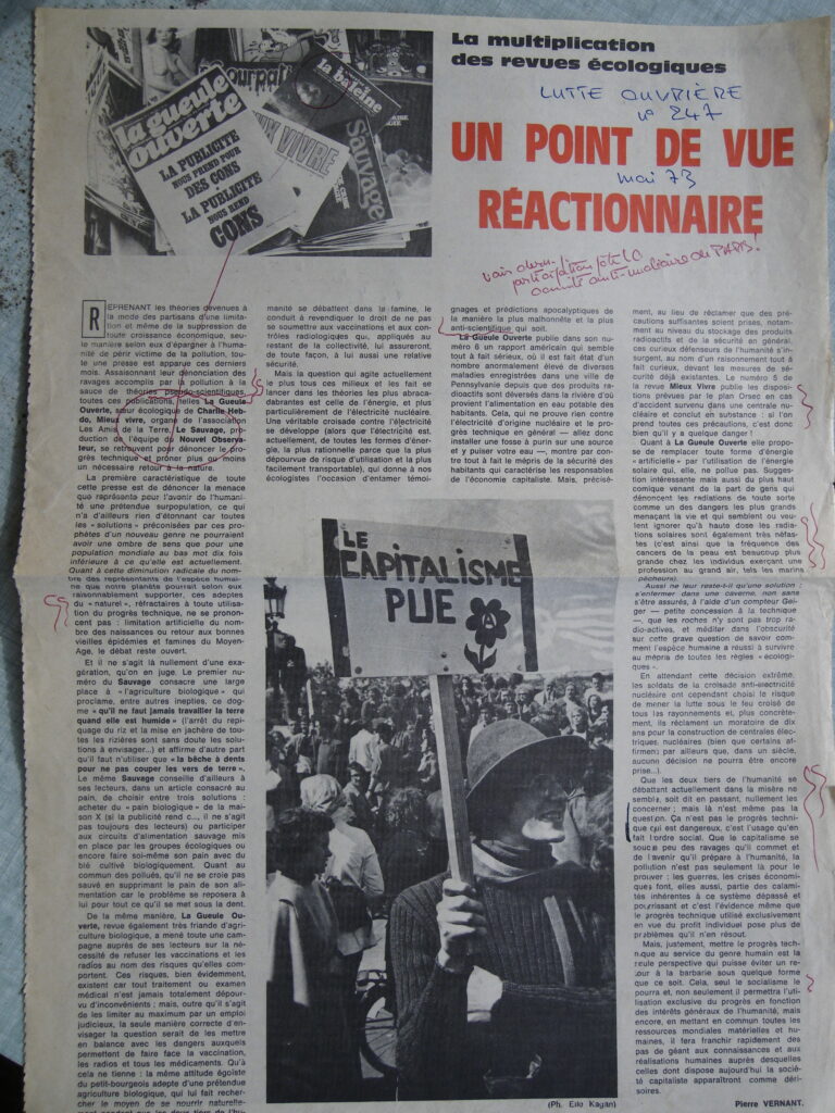 * (« Le « mouvement écologiste« , mise en question ou raison sociale« ,La Gueule Ouverte n° 21, juillet 1974).