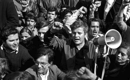 On ne peut, donc, s’étonner des résultats catastrophiques des quarante années qui ont suivi. D’autant qu’il y en avait d’autres encore, moins connus mais tout aussi déterminés et efficaces dans la censure du mouvement écologiste jusqu’à aujourd’hui. L’un d’eux, Jean-Pierre Duteuil du Mouvement du 22 mars (à droite sur la photo ci-dessous), toujours très proche de Daniel Cohn-Bendit, a, plus de quarante ans après, contribué à la censure d’un article sur… Denis de Rougemont, l’agent de l’oligarchie capitaliste, l’un des plus importants acteurs de la propagande anticommuniste et, nous le verrons, du soutien international à la conquête capitaliste : la guerre froide culturelle *. Encore un hasard, probablement.