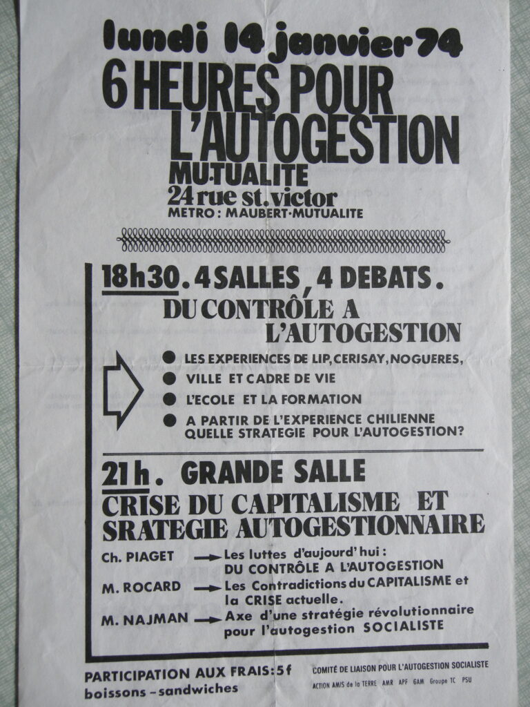 Un an et demi plus tard, le 14 janvier 1974 à la tribune de la Mutualité, lors d’une soirée mémorable, j’entendrai le même Maurice Najman expliquer doctement quel est « l’axe d’une stratégie révolutionnaire pour l’autogestion socialiste« . Que de « révolution » dans leurs discours ! L’expérience du 23 juin 1972 disait quelle était la valeur de ces paroles. Peut-être nous étions-nous trompés ? Ou avions-nous été trompés sur le sens de cette autogestion qui revenait dans les discours de ceux qui semblaient avoir mission de nous entraver. Nous et beaucoup, beaucoup d’autres.
